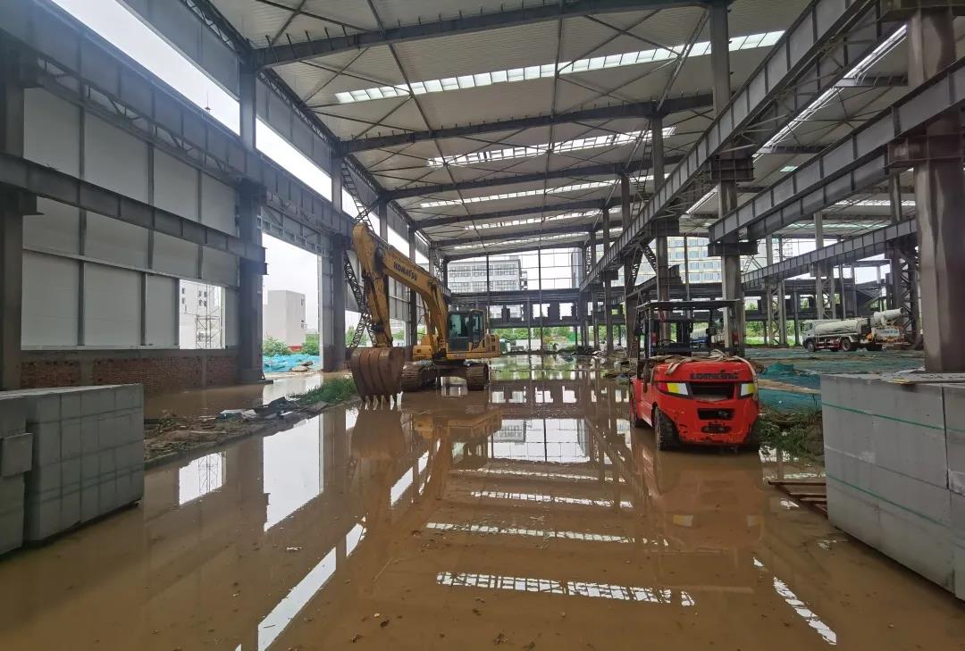 结构件示范工厂工地在这次洪水灾害中,现场站房基坑、设备基础基坑泡水,施工临时用电设备泡水、园区道路大量淤泥、路侧大树倾倒,在这种极端恶劣天气之下,工地指挥部及所有施工人员没有退缩,积极开展自救工作。