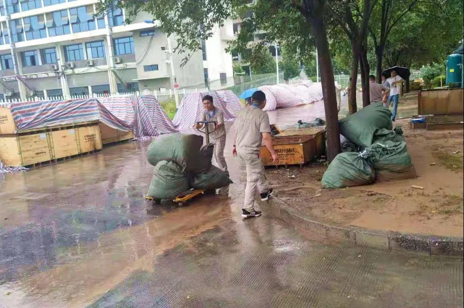冒雨检查屋顶排水口是否通畅、清理堆积的杂物、前往漏水现场、协调解决问题;不顾积水巡视园区,及时发现被雨水冲开的井盖,树立提醒标识;在大雨过后,第一时间帮助清理客户办公区、仓库积水,清理园区内掉落的树枝;7月21日,工作人员挨家挨户为客户做好电路检查,7月22日恢复了用电。当前芝麻街园区每天都在持续进行不留死角的消毒、消杀与清洁,并加强巡视检查,排除安全隐患,最大限度减少损失,确保各方面的安全。